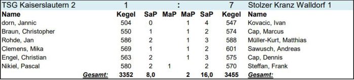 sich durch die insgesamt mehr erzielten Kegel noch MP sichern werden. Für Walldorf ging es also darum, noch ein Duell für sich zu entscheiden, um so ein Unentschieden mit nach Hause zu nehmen. Die